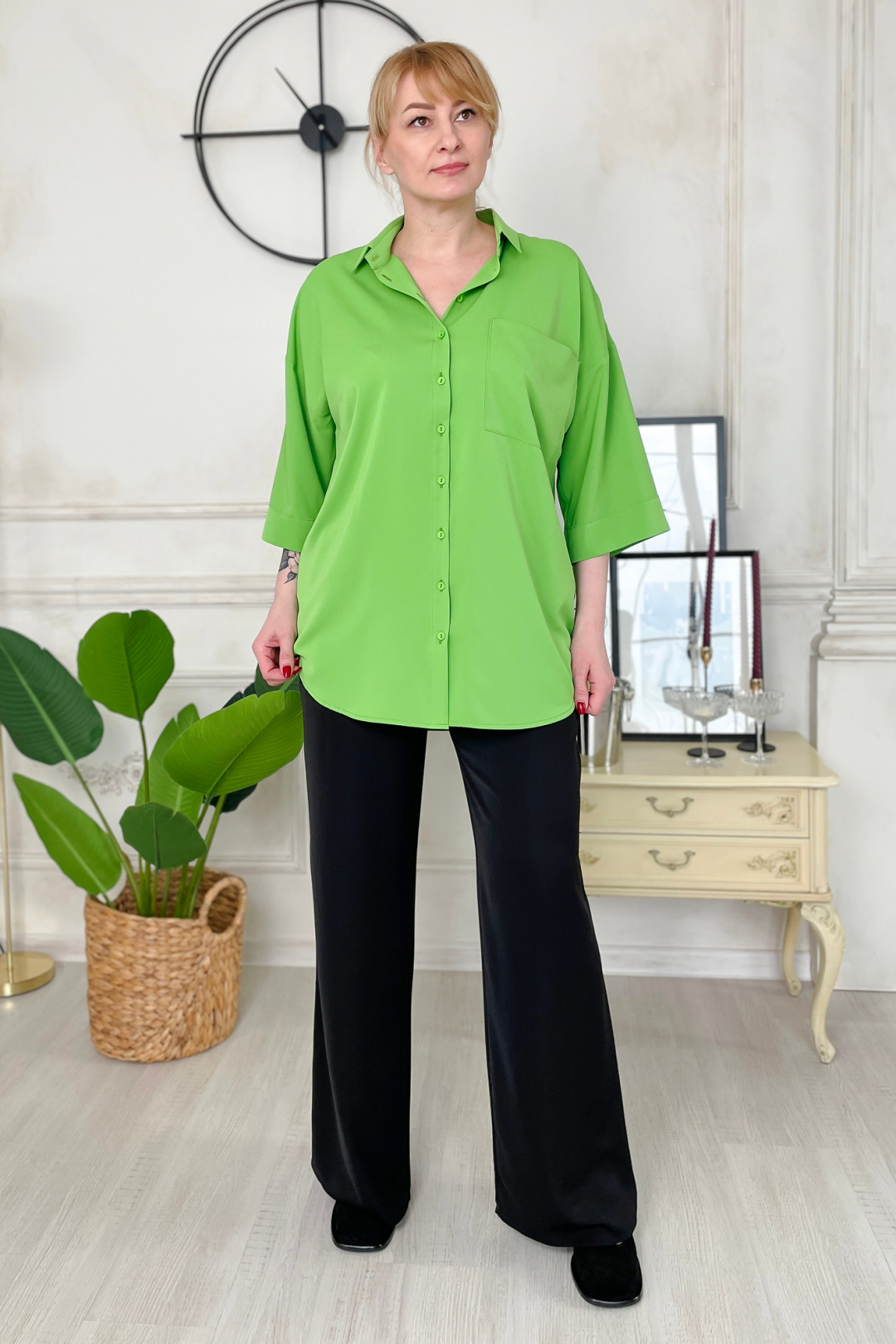 "Блузка женская из текстильной ткани, прямого силуэта. По переду блузки расположен накладной карман. Спинка блузки с кокеткой. Со встречной складкой. Спущенное плечо. Низ рукава обработан манжетой. Низ изделия полукруглый. Вырез горловина оформлен воротником со стойкой. Планка блузы на петлях-пуговицах.